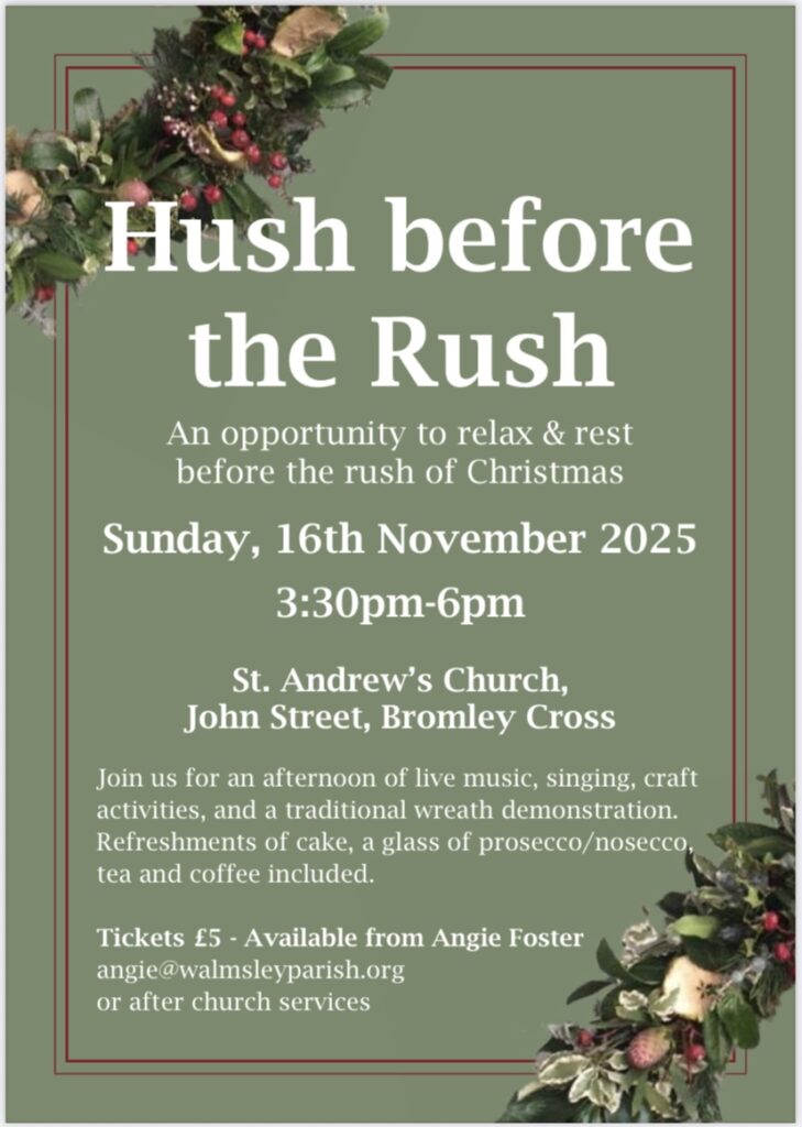 3.30-6pm: ‘HUSH BEFORE THE RUSH’ at St. Andrew’s Church, BX. For more details, contact angie@walmsleyparish.org