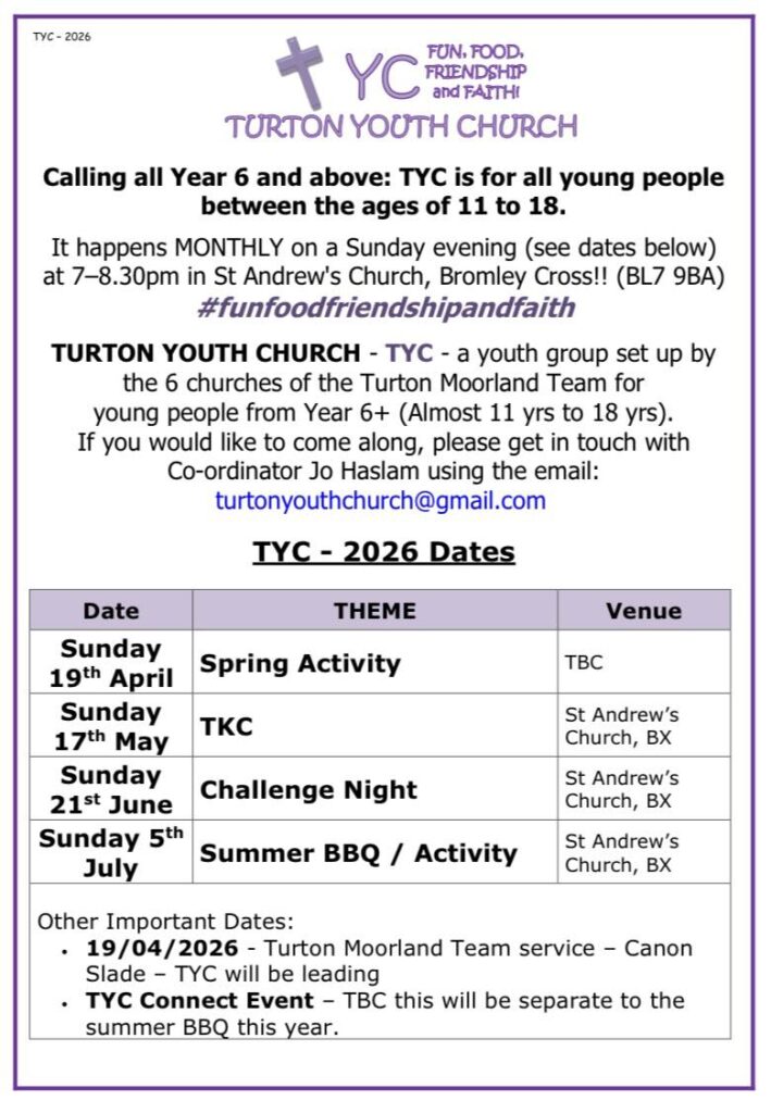Calling all Year 6 and above: TYC is for all young people between the ages of 11 to 18. It happens MONTHLY on a Sunday evening (see dates below) at 7–8.30pm in St Andrew’s Church, Bromley Cross!! (BL7 9BA) #funfoodfriendshipandfaith